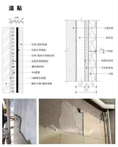 濕貼:指用水泥砂漿或膠泥作為石材粘接劑,基層用水泥類材料打底,再粘貼石材的做法。濕貼的工藝做法,比較節(jié)約空間,而且造價相對低廉。但容易返堿、空鼓。
