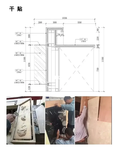 干貼:指用干粉型粘結(jié)劑作為粘貼材料,基層為水泥類材料或其他類型材料打底,再粘貼石材的做法,通常又稱「膠粘」。干粘的做法對安裝高度有要求,不能夠大面積安裝,且抗震性差,造價比濕貼高,多應(yīng)用于吧臺,服務(wù)臺等家具石材飾面的安裝。