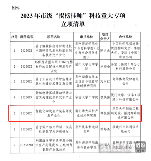 近日,泉州市科學(xué)技術(shù)局印發(fā)《泉州市科學(xué)技術(shù)局關(guān)于公布2023年市級“揭榜掛帥”科技重大專項立項結(jié)果的通知》,南安華大石材產(chǎn)業(yè)技術(shù)研究院與華僑大學(xué)制造工程研究院、福建群峰機械有限公司合作的《智能化砌塊生產(chǎn)裝備開發(fā)及產(chǎn)業(yè)化》項目獲批準立項。