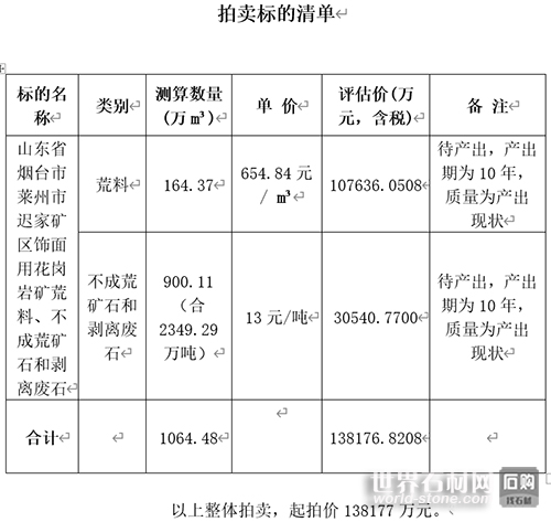 花崗巖礦荒料、不成荒礦石和剝離廢石共1064.48 萬m3公開拍賣