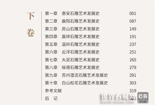 《中國石雕藝術發展史》分上下兩卷,上卷采用從古代藝術品的加工制作的技能方式的發展為主軸,以當時歷史社會背景為補充,分析和梳理了數千年來石質藝術品發展的脈絡。下卷則是匯聚了千百年來我國主要石雕產區的歷史,如惠安、曲陽、房山、嘉祥、溫嶺、云浮、大足、綏德等八個重要石雕產區,和蘇州澄泥石雕、吉林松花石雕刻的藝術發展史。同時,為了將最好的效果呈現給讀者,在2018年和2019年,作者歷經兩次共行程兩萬多公里到全國各有關博物館和石窟地區,自行拍攝了上萬張數字圖片。