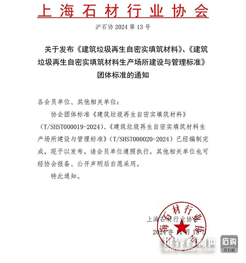 石材網(wǎng)獲悉,日前,上海市石材行業(yè)協(xié)會(huì)發(fā)布《建筑垃圾再生自密實(shí)填筑材料》、《建筑垃圾再生自密實(shí)填筑材料生產(chǎn)場(chǎng)所建設(shè)與管理標(biāo)準(zhǔn)》團(tuán)體標(biāo)準(zhǔn)。