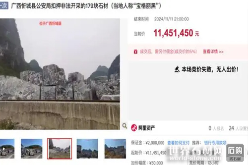 石材網獲悉,11月12日,廣西忻城縣一批被扣押的非法開采石材(當地稱“寶格麗黑”)在阿里拍賣平臺上進行司法拍賣,起拍價為1145萬元,吸引眾多網友關注。然而,雖然圍觀人數多,但截至當晚21點拍賣結束時還無人出價,以致該礦權最終流拍。