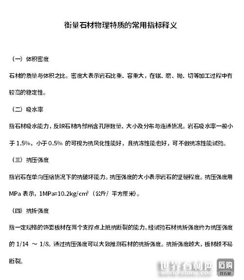 在業內,評價石材的好壞主要是看其外觀質量、加工質量、鏡面光澤度三方面,還有體積密度、吸水率、抗壓強度、抗折強度等物理指標。