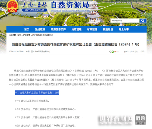石材網獲悉,近日 ,廣西玉林博白縣松旺鎮吉水村飾面用花崗巖礦采礦權在玉林市自然資源交易中心掛牌出讓,出讓20年,1.3億元起拍!