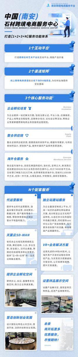 據(jù)了解,該服務(wù)中心通過打造“1+2+3+N”的服務(wù)模式,將為入駐石材企業(yè)提供完善的服務(wù),包括一站式解決方案、整合海內(nèi)外供應(yīng)鏈和海外倉資源,以及提供代運(yùn)營服務(wù)、獨(dú)立站建站、以及孵化空間等服務(wù),助力企業(yè)獲得合適的海外訂單,提高轉(zhuǎn)化率。