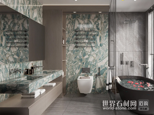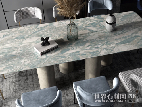 石材特征:獨(dú)特的湖水藍(lán)是這款石材給人最深刻的印象,淡淡的藍(lán)色搭配顆粒狀的石塊,有著河邊鵝卵石的既視感,呈現(xiàn)著自然的原味與野趣。