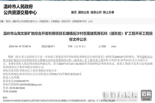 中國石材網獲悉,近日,浙江省臺州市溫嶺市公共資源交易中心發布了溫嶺市山海文旅礦地綜合開發利用項目石塘鎮后沙村岙里建筑用石料(凝灰巖)礦工程開采工程招標文件(資格預審文件),標志著此項工程將于近日招標。