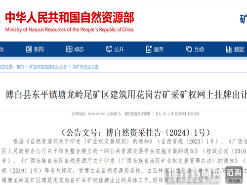 中國石材網(wǎng)獲悉,近日, 受博白縣自然資源局委托,由玉林市自然資源交易中心組織實(shí)施博白縣東平鎮(zhèn)塘龍嶺尾礦區(qū)建筑用花崗巖礦采礦權(quán)掛牌出讓的具體工作,主要事項(xiàng)如下: