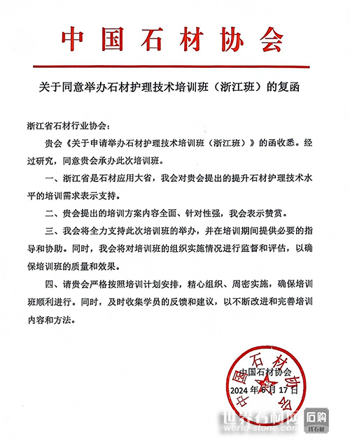 中國石材網了解到,為進一步提高石材護理的專業化、規范化水平,并滿足廣大從業人員對提升石材護理技術的迫切需求,浙江省石材協會向中國石材協會申請,舉辦浙江省石材護理工職業技能培訓班,獲得了同意和支持。