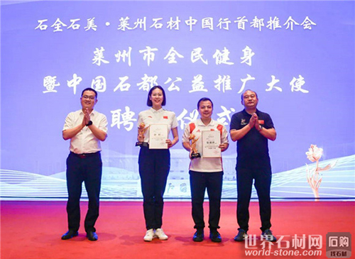 作為品牌系列活動之一,此次會上也對第二屆中國石都萊州國際全民健身徒步活動進行了重點推介,活動將結合第十六屆中國(萊州)國際石材展覽會的重要節(jié)點,通過全民健身品牌賽事活動的開展,旨在全方位、立體化展示萊州城市形象和文化底蘊,為參與者帶來一場集石材商貿、健身休閑與文化體驗于一體的盛會,進而助力萊州石材產業(yè)綠色低碳高質量發(fā)展。與此同時,向花樣游泳世界冠軍鐘輗、舉重奧運冠軍張湘祥頒發(fā)了“萊州市全民健身暨中國石都公益推廣大使聘書”,為萊州石材產業(yè)的品牌建設和市場推廣注入了新的活力。