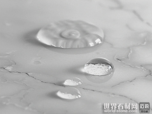 4.看吸水性。小水滴也能透露出大秘密!在背板滴上小水滴,吸水性小的石材,水滴會凝聚成小球,不易滲入;反之水滴會在石材表面留下水印,說明該