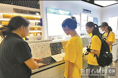 接著,實踐隊一行走進了鵬翔再生石科技館,感受到了“再生石”的綠色魅力。在“重生之境”展示區,隊員們看到廢舊石材邊角料通過設計賦能,巧妙構建出富含藝術美感和環保理念的空間場景,生動傳達“再生”環保理念。在館內隊員們還同各國聽、聞、觸摸等不同維度感受“再生石”獨有的生活美學。據介紹,該企業著力強化對廢棄的石材邊角料、礦渣等資源的回收再利用,以創新技術和獨特工藝推出環保“再生石”。