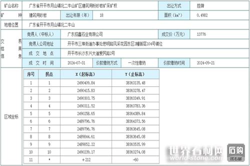石材網獲悉, 日前,廣東省江門市開平市月山鎮北二牛山礦區建筑用粉砂巖礦采礦權成功出讓,被當地民企廣東招鑫石業有限公司以底價競得 。該礦資源儲量4513.8萬方,設計生產規模200萬方/年,擬出讓18年,成交價13776萬元,需一次性支付。
