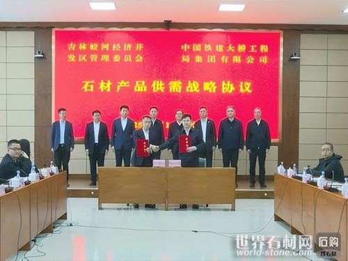 在隨后舉行的石材行業產需對接會上,與會者共同觀看了介紹蛟河市風采的宣傳片,并就石材產品的特性、規格、銷售渠道以及石材產業的整體發展狀況進行了深入交流。此外,蛟河經濟開發區黨工委書記陳連波分別與中國鐵建大橋工程局集團第二工程有限公司副總經理于博和中國水利水電第一工程局有限公司副總工程師兼設備物資部主任于合春簽署了戰略合作協議。