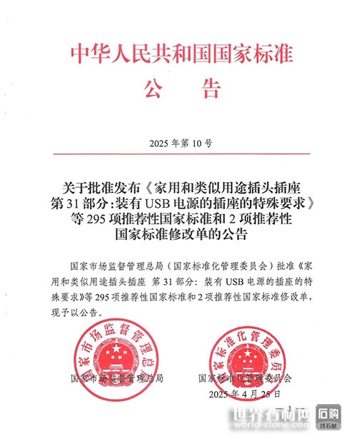 石材網獲悉,近日,國家市場監督管理總局(國家標準化管理委員會)批準并發布了包括《家用和類似用途插頭插座第31部分:裝有USB電源的插座的特殊要求》在內的295項推薦性國家標準及2項推薦性國家標準修改單。此次發布的標準中,特別值得關注的是三項與石材相關的標準,分別為: