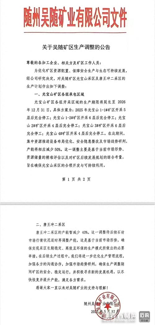 石材網獲悉,為優化吳隨礦區石材資源配置,確保安全生產與生態環境的可持續發展,隨州吳隨礦業有限公司決定對光寶山采區及唐王沖二采區的生產計劃進行調整并于5月12日發布有關通知,希望大家理解和支持。具體內容如下: