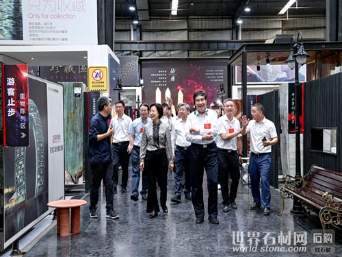 調研組成員邊走邊看,對石材體驗館的空間設計、藝術展示及生活場景應用給予高度評價,認為其不僅展現了石材的多元可能性,也進一步拓展了消費市場的想象空間。