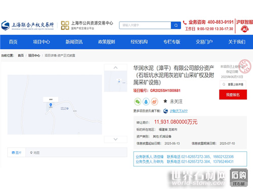石材網(wǎng)獲悉,6月13日,上海聯(lián)合產(chǎn)權(quán)交易所發(fā)布了關(guān)于華潤水泥(漳平)有限公司部分資產(chǎn)的掛牌轉(zhuǎn)讓公告。此次轉(zhuǎn)讓標(biāo)的為福建省漳平市拱橋鎮(zhèn)巖高村的石坂坑水泥用灰?guī)r礦山采礦權(quán)及其附屬采礦設(shè)施,轉(zhuǎn)讓底價(jià)接近1.2億元人民幣,并要求一次性付款。