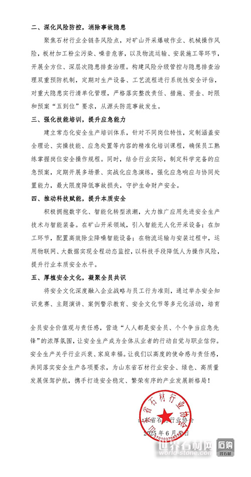 山東省石材行業(yè)協(xié)會(huì)發(fā)出倡議:共筑安全生產(chǎn)防線,推動(dòng)石業(yè)高質(zhì)量發(fā)展