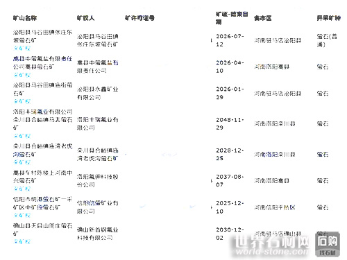 在欒川-嵩縣地區(qū),發(fā)現(xiàn)了多處大中型螢石礦產(chǎn)地,累計資源量超過1000萬噸,為當(dāng)?shù)鼐毞すI(yè)的發(fā)展提供了充足的資源支持。根據(jù)最新的數(shù)據(jù),河南省目前擁有38個螢石礦的礦權(quán)證書(包括探礦權(quán)和采礦權(quán)),這些信息可以通過礦通小程序查詢。