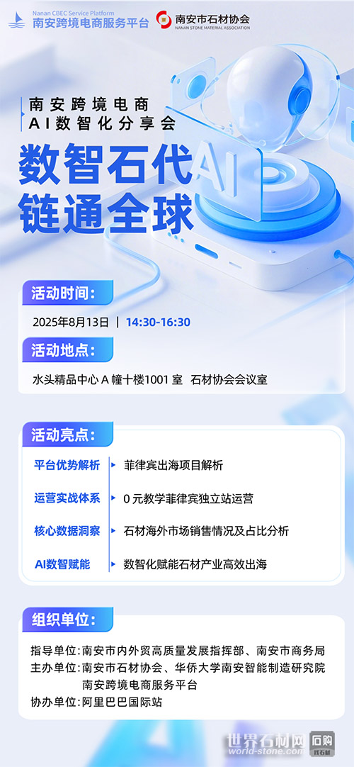 石材網(wǎng)獲悉,為搶抓全球跨境電商發(fā)展新機(jī)遇,加速推動(dòng)石材產(chǎn)業(yè)數(shù)字化轉(zhuǎn)型升級(jí)與全球化戰(zhàn)略布局,助力南安石材企業(yè)揚(yáng)帆出海、鏈接世界,由南安市內(nèi)外貿(mào)高質(zhì)量發(fā)展指揮部、南安市商務(wù)局指導(dǎo),南安市石材協(xié)會(huì)參與主辦的“數(shù)智石代 鏈通全球”南安跨境電商AI數(shù)智化分享會(huì)即將隆重舉行。