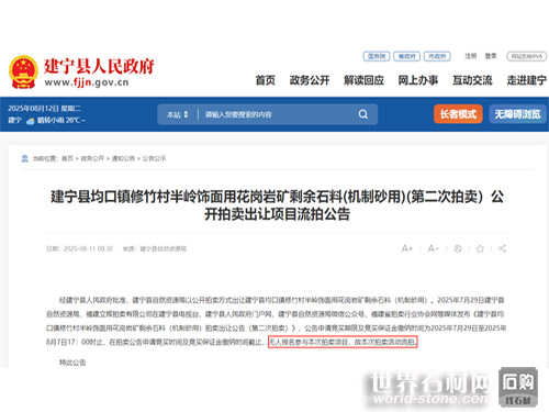 石材網獲悉,近日,福建省建寧縣自然資源局與福建立輝拍賣有限公司聯合發布了《建寧縣均口鎮修竹村半嶺飾面用花崗巖礦剩余石料(機制砂用)(第二次拍賣)公開拍賣出讓項目流拍公告》。此次拍賣原定于2025年7月29日至2025年8月7日17:00接受競買申請及保證金繳納,然而,在規定的截止時間內,未收到任何競買者的報名申請,導致本次拍賣活動最終未能成交。
