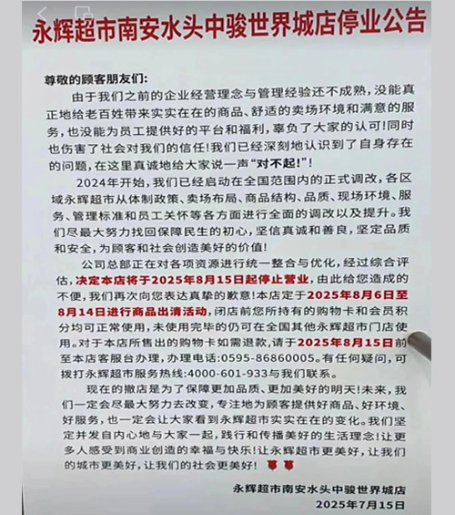 然而,如今的水頭鎮,已不復往日的熱鬧。走進石材市場,一扇扇緊閉的鋪面連成一片,玻璃門上蒙著薄塵,“轉租”“轉讓”的告示在風中輕輕搖晃,像秋葉般無聲飄零。偶有商戶守著半間門面,低頭刷著手機,見人經過才勉強抬頭問一句:“看石材嗎?”語氣里透著疲憊與無奈。更令人唏噓的是,連曾為居民生活帶來便利的兩家永輝超市,也未能幸免于這波寒流,相繼停業。空蕩的貨架、寂靜的入口,成了人們口中低聲嘆息的注腳。